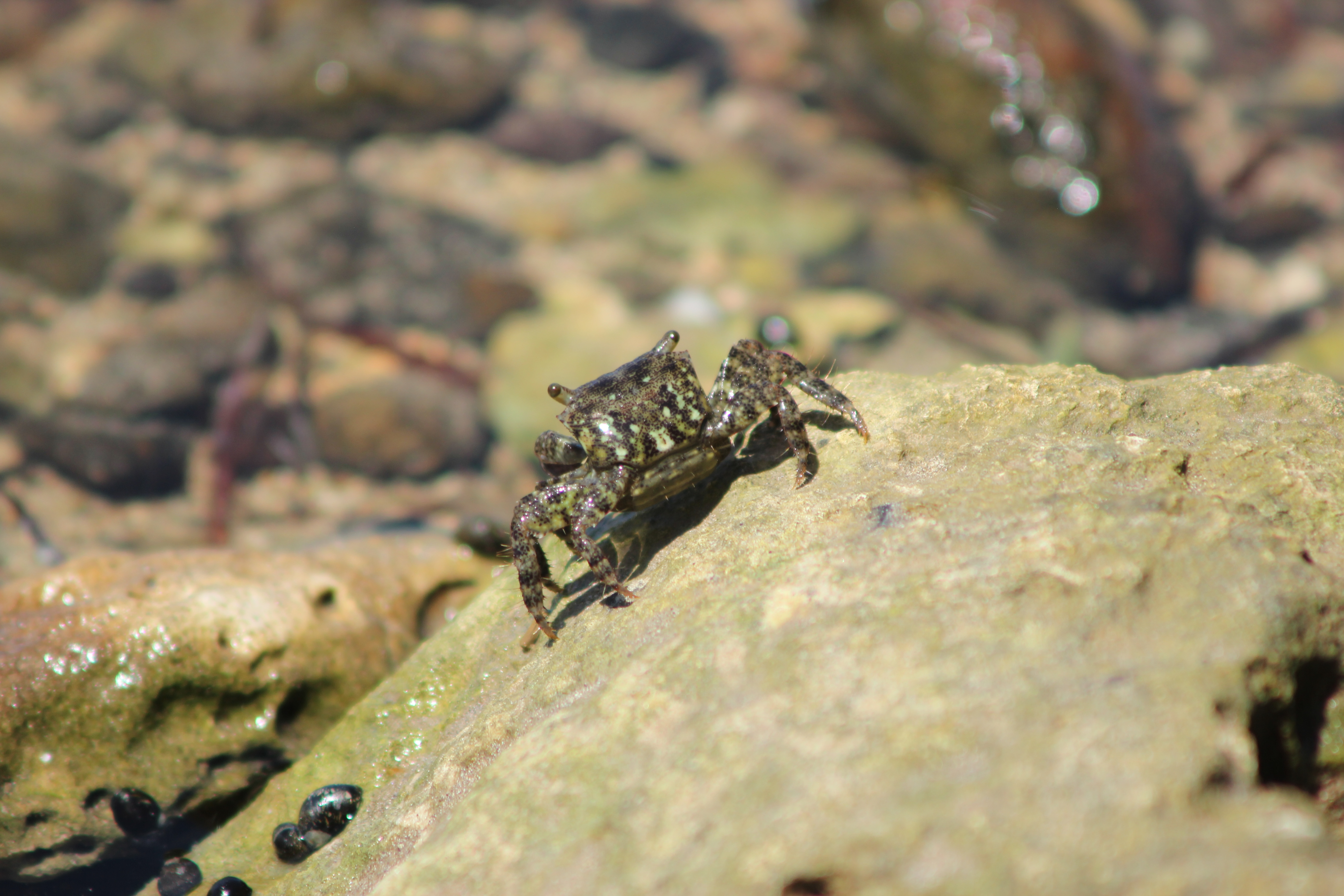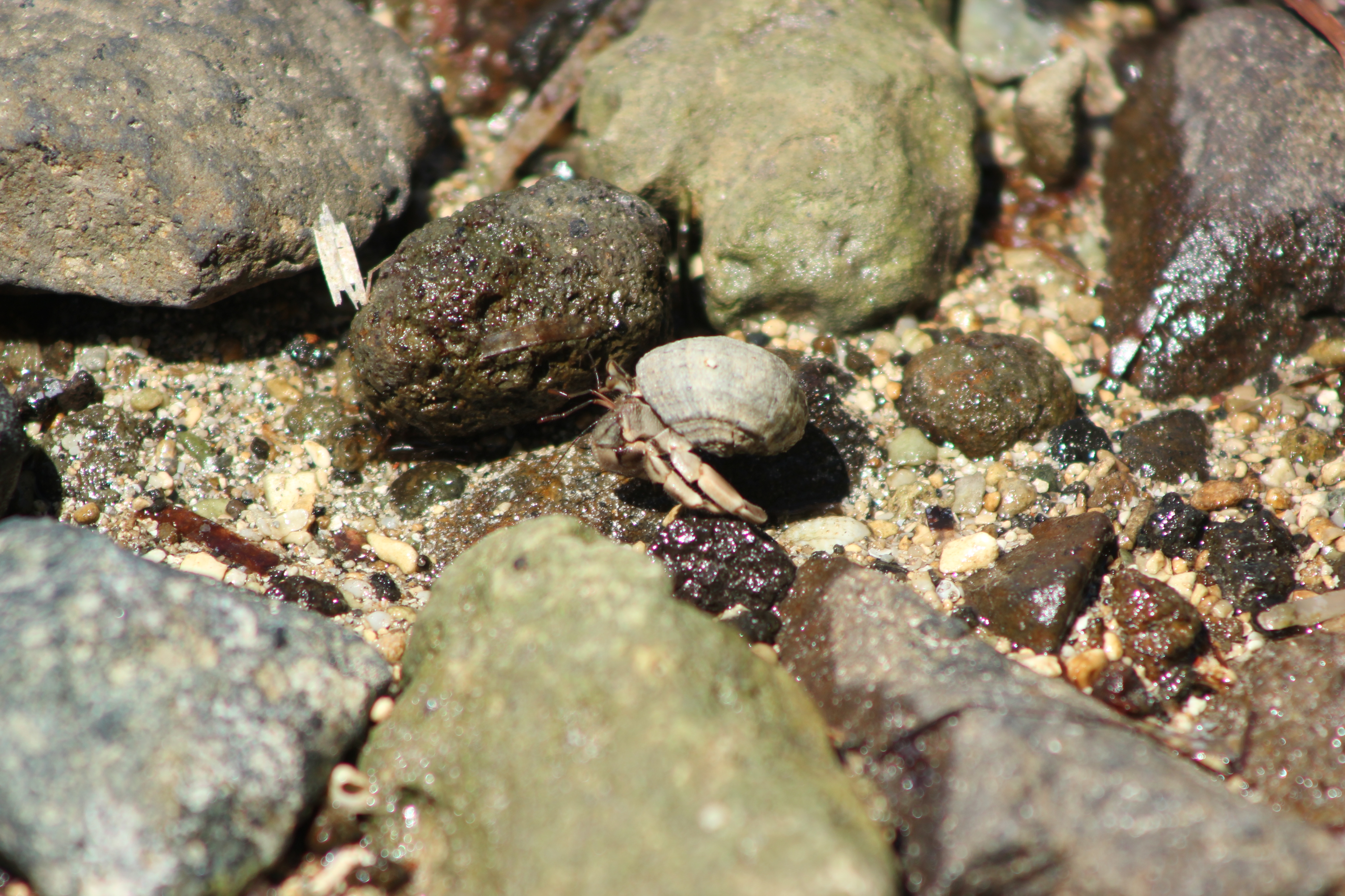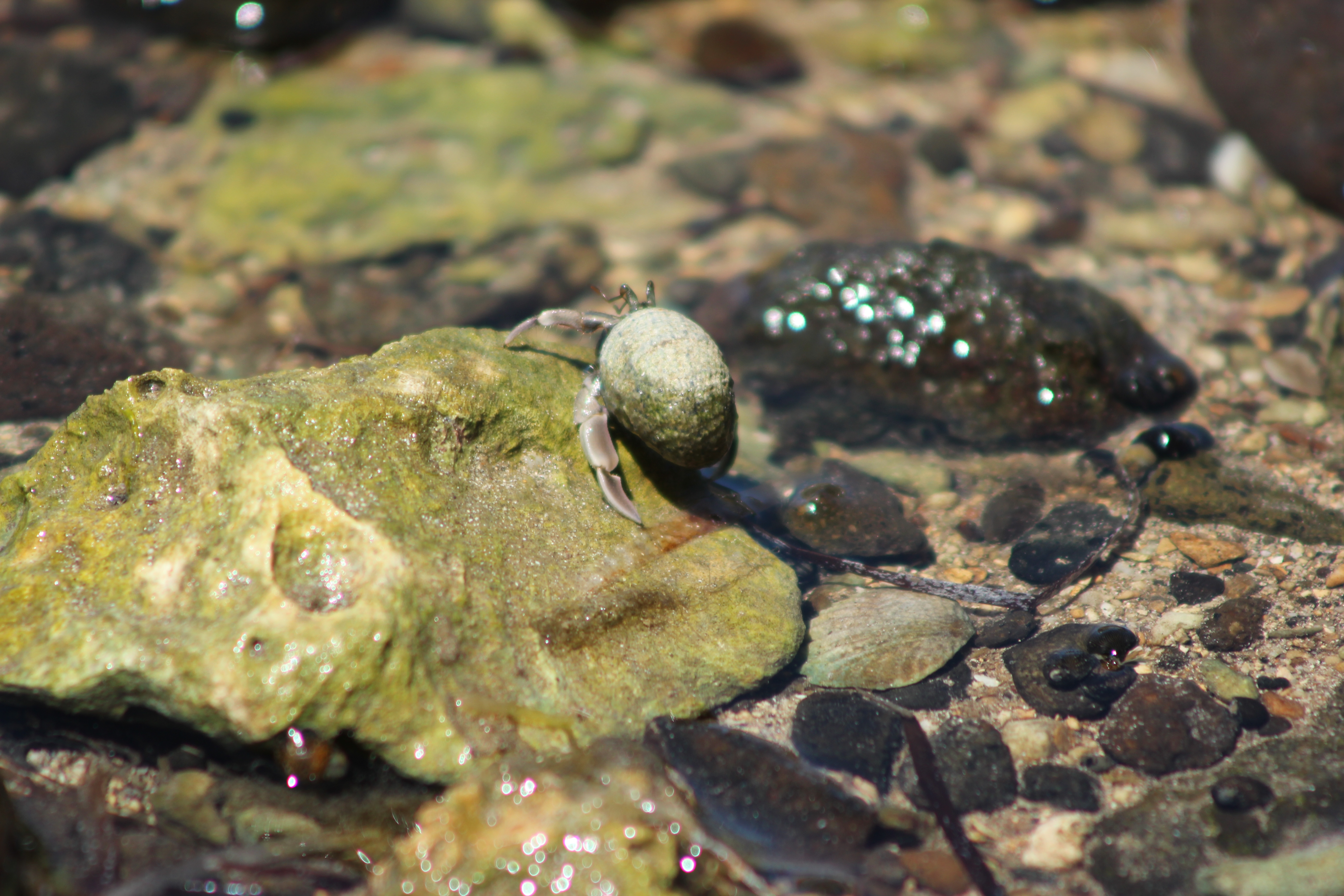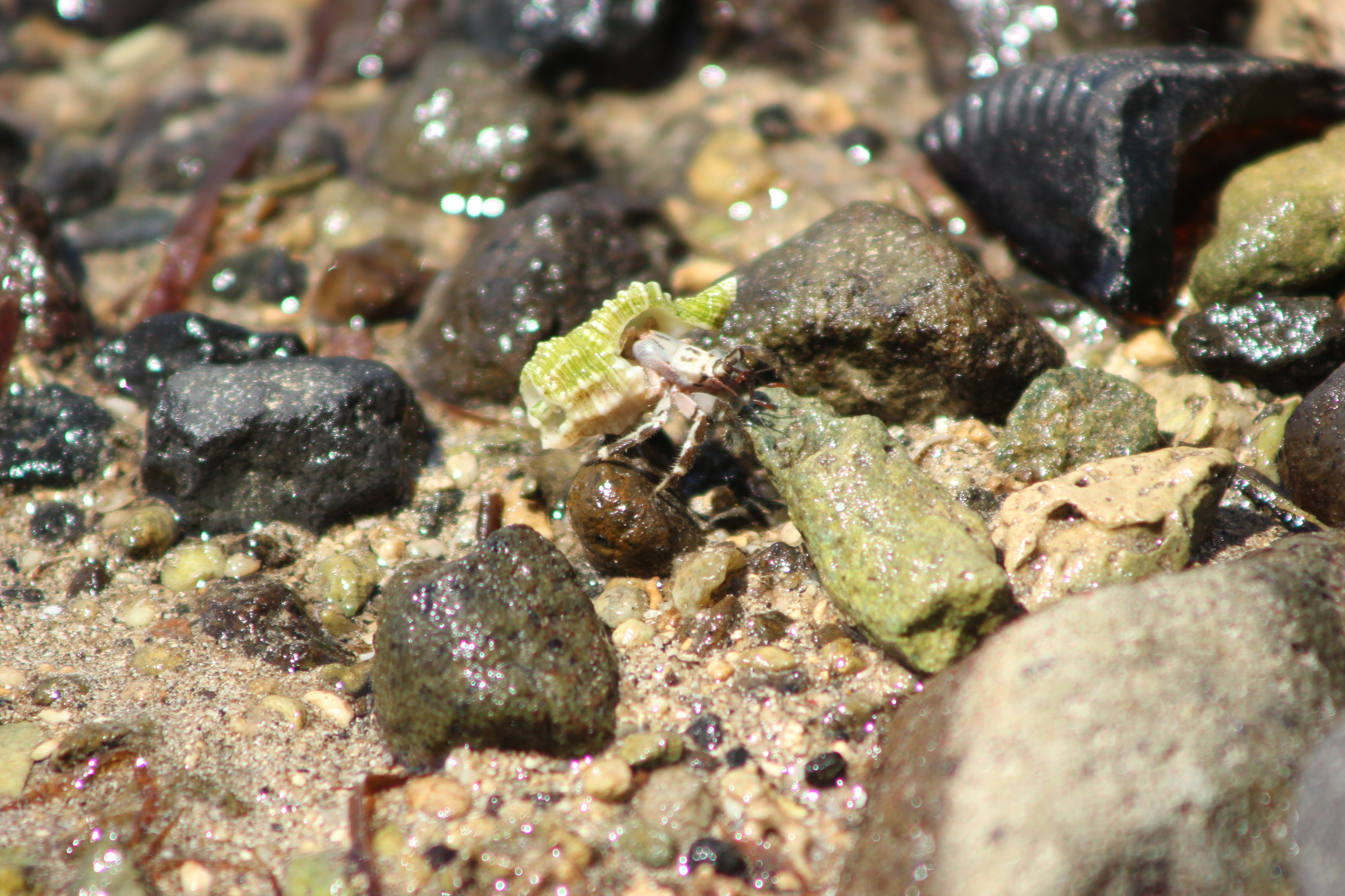 This weeks adventure was only a small one down at the beach looking for small animals in the rock pools. When walking over the rocky shore everything seems to be static, and the rocks behave exactly how one would expect a rock to. It is when you sit still for a few minutes that the magic happens. All of those tiny rocks start to move, and somehow they all know exactly when to start moving as they all go at exactly the same time! Brave little hermit crabs, who walk around with their heavy, camouflaged home on their back hypnotised me for a whole afternoon!